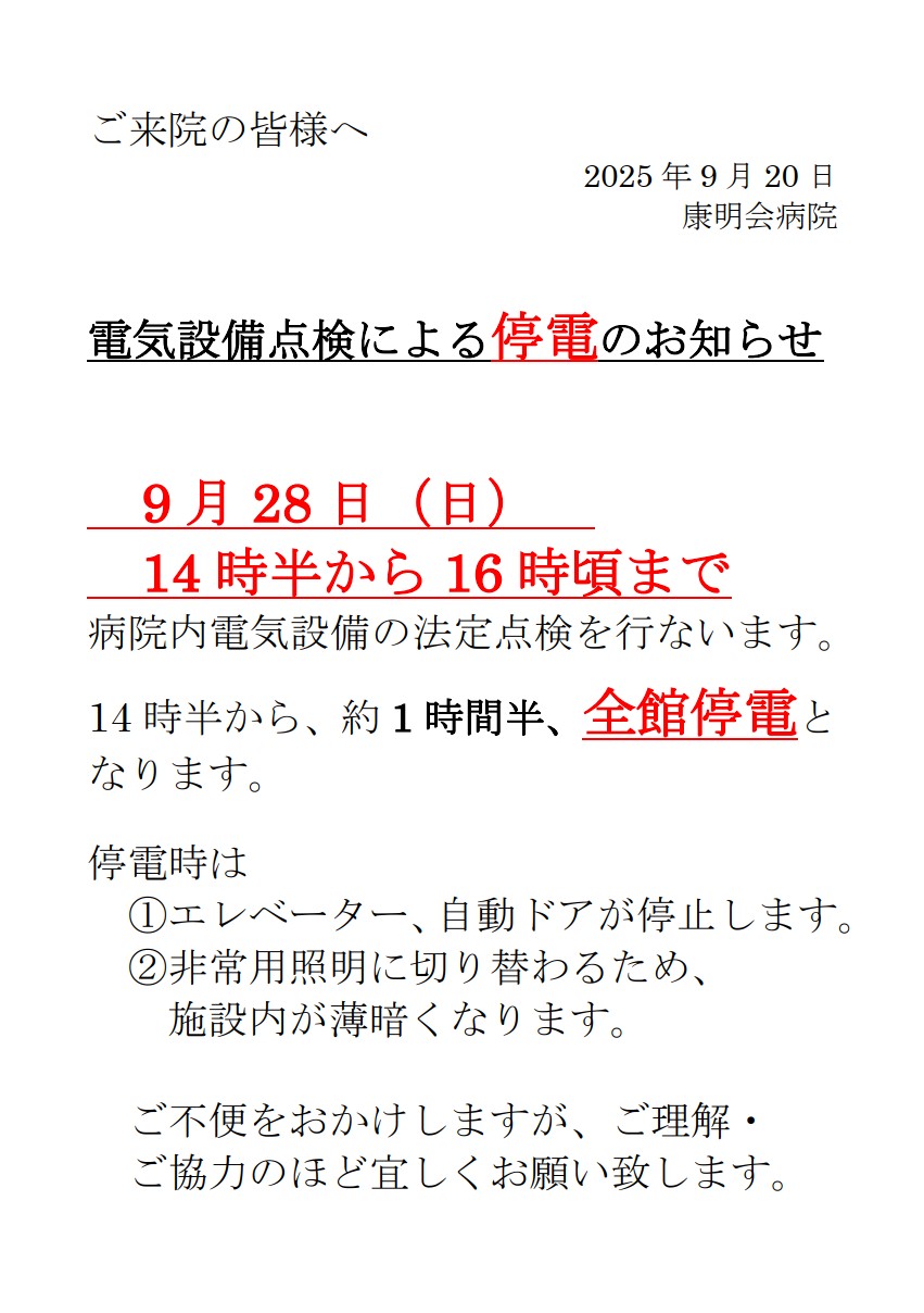 2025/09/25 お知らせ 停電のお知らせ(9月28日) 当院は9月28日に全館停電となります。面会は可能ですが、ご不便をおかけしますので、下記日時を避けていただくことをお勧めします。ご理解ご協力の程よろしくお願い申し上げます。 前へ一覧へ戻る次へ